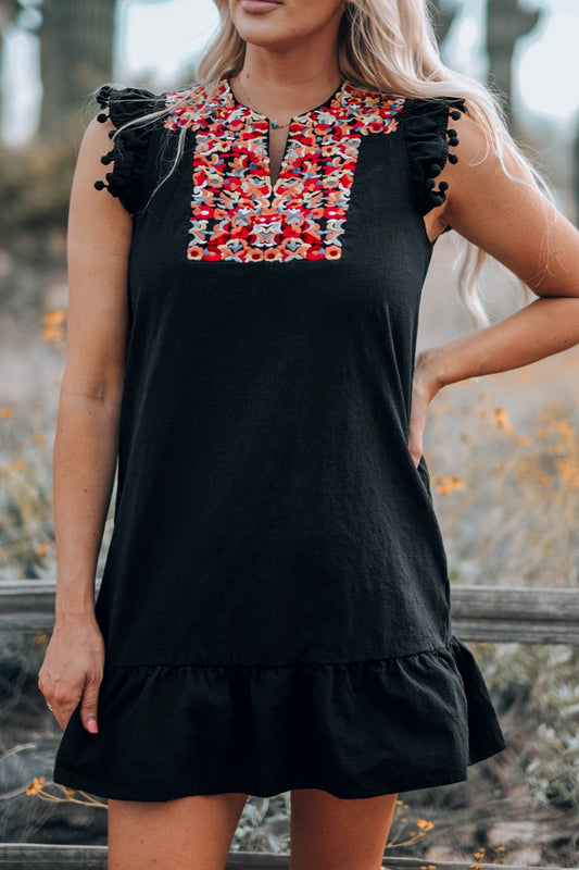 Black Boho Print Pompom Sleeve Mini Dress | Floral Detailing